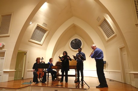 Two or three run-throughs of the “Mein Freund” are performed to get tempo right for Saunders, allow DuPont to adjust his projection, and give Ferrell, playing the oboe part on flute, the chance to wrestle with Bach’s zigzags from major to minor. With the concert just days away, interchange between the artists is relaxed and quiet, not a sliver of anxiety or nerves in the air.