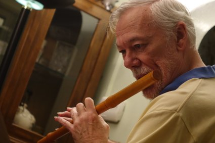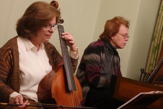 Sidling past Edward Ferrell, already poised behind his music stand to play his flauto traverso in a Bach aria, you find Jacob sitting behind her harpsichord at the opposite corner. Next to the leader sits Holly Wright Maurer, her viola da gamba nestled between her knees. You can’t say she’s in the rhythm corner with Jacob because, in this intimate space, she partially obstructs the way to the kitchen.