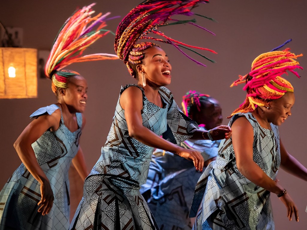 Spread across the stage, four women in amazing multicolored braids on each side of Kiki, are a group of live light-givers, the inspirational Ingoma Nshya (“New Drum” or “New Power” if you don’t speak Kinyarwandan): The Women Drummers of Rwanda. In the wake of the 1994 genocide, a grassroots movement incorporating all of Kiki’s constructive and conciliatory impulses founded the first Rawandan women’s drum circle in centuries – overturning a taboo against women even touching a drum or approaching a drummer.