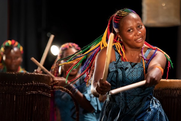 The group’s name proves to be rather modest, for the women not only pound complex arrangements by Mutangana Mediatrice on their large conga drums, they sing impressively – as soloists or as a chorus – and they also dance, swinging their multicolored braids as part of the choreography or in pure joy. Translations of the songs are projected upstage, where we also see animations that accompany the testimonial letters and the animal fable.