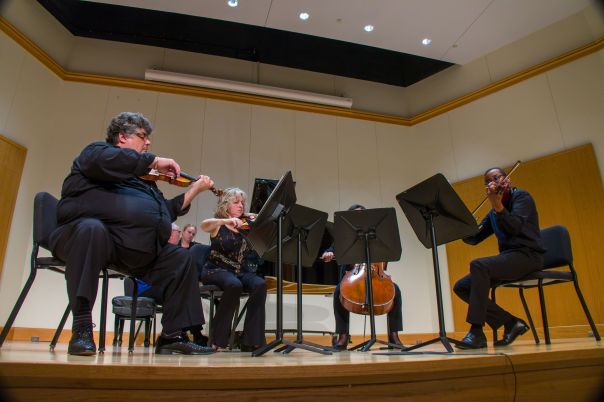 Boboc had her most memorable spot in the Allegro Finale when we jumped away from the spirited interplay between Bush and Lupanu into a fugal section where Ballena and Pyle also got a taste. There were also harmonious sections that reminded me of the uniqueness of Dvořák’s string quartets. Yet it was Bush who was most dominant at the concert’s climax, trilling and ding-a-linging merrily before he ramped up the speed and intensity toward the very end. Obviously relishing the encounter, Lupanu matched him note for note as they raced to the precipice.