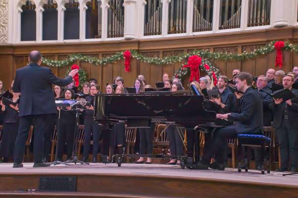 After an acapella rendition of “The Christmas Song” by the Chorale – with Reid repeating the final bars – the program built to a simple and sublime climax as Biedenbender accompanied Reid in a fervid rendition of Adolphe Charles Adam’s glorious “O Holy Night.” I’d never known that the song had three stanzas in English, compared to just two in the original French lyric by Placide Cappeau that inspired Adam. We can thus forgive a Celine Dion for only singing two, but for Reid to sing a second and a third stanza provided a wonderful surprise and a singular experience.