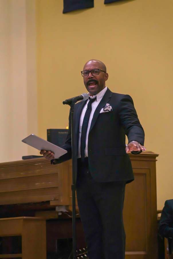 Potter’s programming for “Christmas with the Charlotte Master Chorale: Home” consistently accommodated this kind of generous latitude. Of course, there were seasonal favorites tailored for the theme, including “I’ll Be Home for Christmas,” Mel Tormé’s “The Christmas Song,” and – presented as a Biedenbender instrumental – “Home for the Holidays.” Nobody onstage at First United displayed any liking for the Christmas songs I dread and loathe, so we were never assaulted with the annoying fun of “Jingle Bells” or the torturous tedium of “The Little Drummer Boy.” Nor were the unexpected readings from Reid overladen with saccharine or sentimentality. Sara Teasdale’s “A Winter Night” and Ella Wheeler Wilcox’s “The Year” were both somber and seasonal. Even the excerpt from the Dickens classic, “Ignorance and Want,” refrained from depicting a vapid, gleeful wonderland.