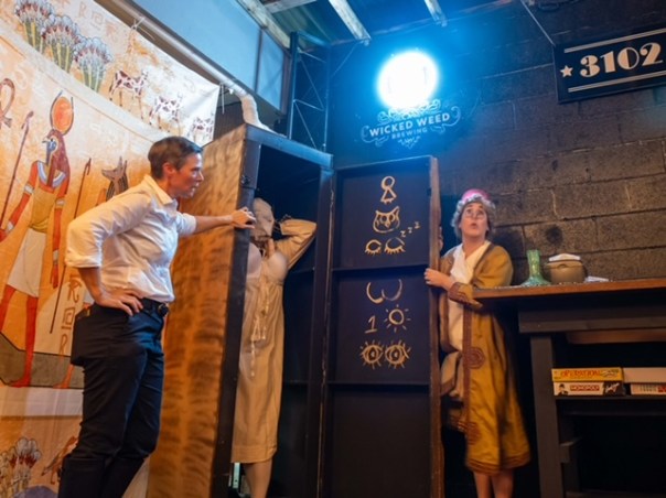 Then before intermission, the aluminum loading dock closure at VisArt Video was raised by the entire cast of two, Nicia Carla and Andrea King, while we joined them on the other side, exiting through the front door to the outside alleyway – the al fresco part of the store. The final Egyptian scene was played out on a second stage, facing out to a few seats, under the shadow of a Wicked Weed Brewing sign. With a nifty little Egyptian tapestry and a fairly gaudy, full-sized sarcophagus.