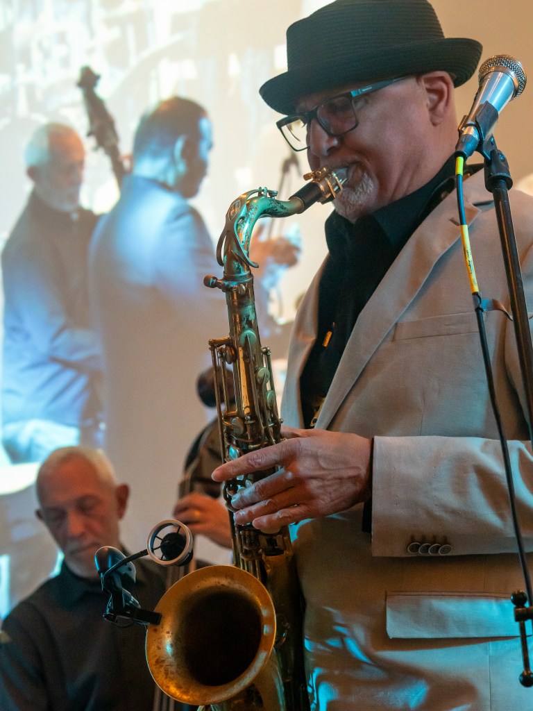 Once again it was “Falling in Love Again,” with Bearde elucidating on his composition at greater length before performing it this time. Further engaging us, he encouraged us in the audience to clap out the rhythm as Freidline, chided all through concert for his snazzy (and Sinatra-like) chapeau, pounded out a genial piano intro. Everybody was in great spirits by this point, and Ziad gave us one more reason to applaud with his screaming tenor sax.