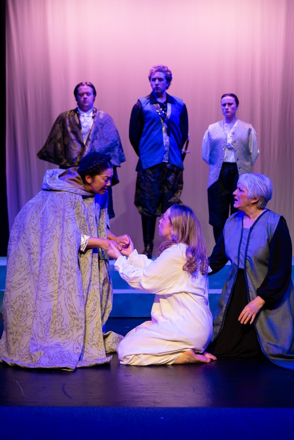 Not to worry, Braza resurfaces in Scene 3 of Act 4 as the roguish Autolycus. The remaining members of the core troupe, mostly with prior SSCO experience, also shuffle multiple roles and costumes backstage – with a couple of players besides Deal flipping genders. Most prominently, these include Iesha Nyree morphing from one of Hermione’s ladies to the Old Shepherd who parents Perdita, the sequestered newborn, and Emma Brand, becoming the grown-up foundling after a stint as Lord Cleomenes.
