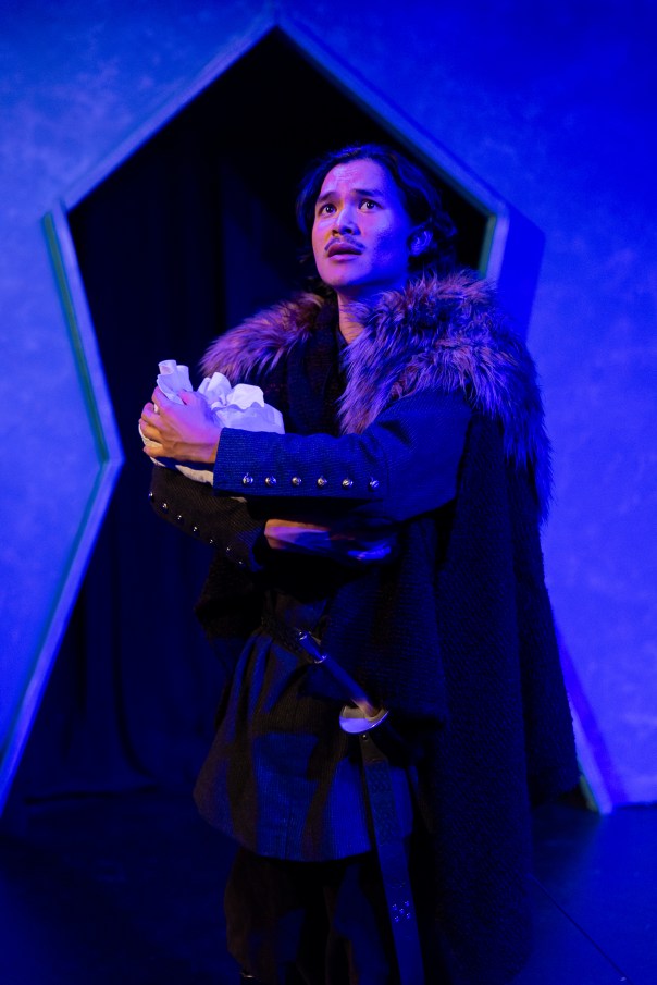 We won’t hear any more of them for 20 years. Meanwhile, Act 2 applies a fairytale patina to the action as Leontes, dissuaded from burning his newborn daughter by Lord Antigonus, dispatches milord to abandon the babe in a faraway place to the mercy of the elements. We last see Andre Braza as Antigonus at the end of Act 3, sent offstage with Shakespeare’s most famous stage direction, “Exit, pursued by a bear.”