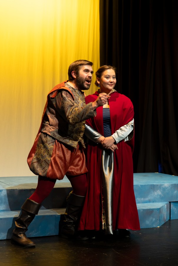 Katy and Chester Shepherd, co-founders of the touring company, are often at the forefront of their productions. But here, they are behind-the-scenes – and they have, artistically, split up. Chester is handling the stage direction and scenic design, while Katy has designed and constructed the costumes. Another blissfully theatrical couple, Brandon and Rachel Dawson, portray the jealousy-crossed leads, Leontes and Hermione, the King and Queen of Sicilia.