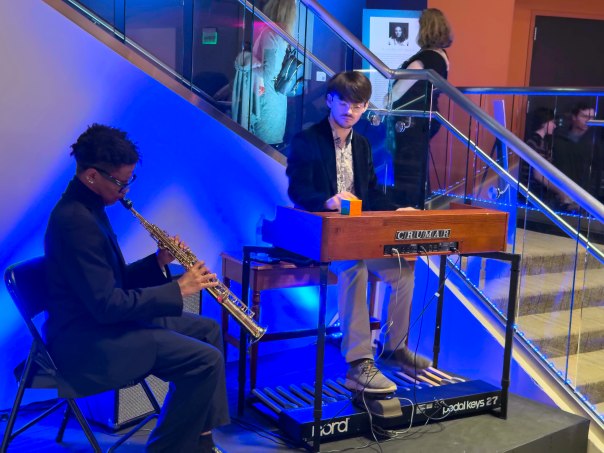 Completing the clubby feel of intermission, festive audience members line up for food and drink, so they can be toting a soda or a highball while viewing the exhibits or claiming one of the precious few cocktail tables downstairs as they nibble to the music and schmooze. On the night we went, it was Jonah Bechtler on keys and Noah Kibonge on soprano sax, pumping out jazz standards such as Bobby Timmons’ “Moanin’.”