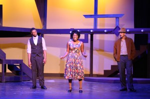 Of course, a long while in a production that zipped through Holter’s script in less than 90 minutes wasn’t uncomfortably long. What Christopher continued to do extremely well was cut down on key moments when actors read from their scripts. For most of the production, actors were off-book and the booklets they clutched served as reminders of their cues rather than reading material. We were aware of the scripts onstage, but the flow of the action and the actors’ lively energy grabbed nearly all our attention. If anything, the occasional peep at a script reminded us how quickly and thoroughly this cast had mastered its essence with just a few rehearsals.