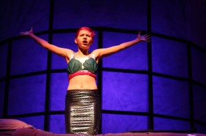 It’s fortunate, then, that the Actor’s Theatre reprise directed by Laley Lippard layers on so much visual lyricism, a magical mix of set and sound design by Chip Decker, costumes by Carrie Cranford, and lighting by Hallie Gray. Adults and even Vi’s best friend Jacob look comparatively humdrum, and so do their surroundings. But when we ascend to Vi’s bedroom, the aqua colors glow and the mermaid couture glitters – worn by both Vi and her hermaphroditic online inspiration, Merperson/Crux.