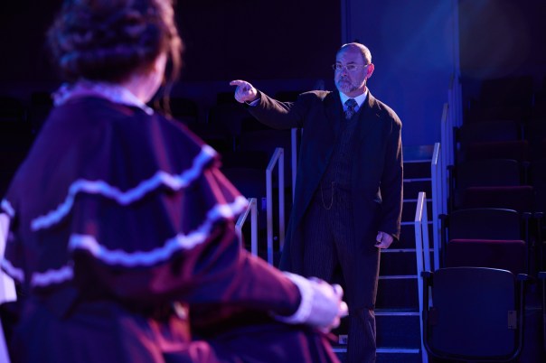 The same can be said of size and scale, which may also have muffled my enjoyment of productions at Belk Theater in 2007 and Halton Theater. There’s something so right about our little séance in the dark at the Old Barn on Queens Road that it cannot attain in a more modern and spacious hall where the Man in Chair must project his spell into a distant balcony. The homeliness of the Man’s urban dwelling also sits better on Queens Road than in the bowels of a bank building on Tryon Street.