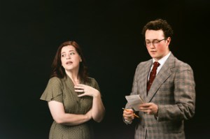 Detachment and inhumanity are inevitable results of the plum jobs Susan is able to land at Auschwitz. The cushiest requires nothing more of her than drawing a line through the names of fellow prisoners, thousands of them, who have passed through “the gas” and the crematoriums. Another requires her to sort through the clothes and possessions of those who haven’t been as lucky as she has been – she can even scavenge some choice articles of clothing. No doubt this aspect of the story fascinated LaBorde as he adapted Cernyak-Spatz’s sprawling memoir for the stage. Thinking of changes in wardrobe as the organizing principle of Susan’s narrative is his idea, not hers. Magda Guichard’s wide range of costume designs help LaBorde depict Susan’s precipitous fall from her upper middle-class status in Vienna to her total degradation at the Birkenau death camp. Delamar spares Giles from the fullest indignities that the script allows, letting his star wear a flesh-colored leotard when Susan is ordered to strip for a delousing shower and allowing her to retain her own disheveled hair when she is shaven bald. A sleekly coiffed wig is removed to suggest the transition.