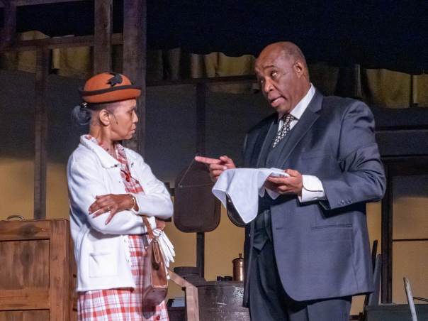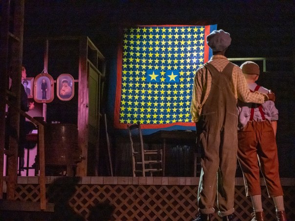 In the face of such humiliating catastrophe, Alice wished to exile herself to the Adirondacks, but Charlie Grass managed even here not to be overly annoying in her shame and mortification as the one “normal” member of her family. Love and practicality are nicely mixed in this Alice. Serene and optimistic as ever, Martin, Penny, and Paul are able to laugh off the misadventures of the previous night. Newcomer as Penny, Jeremy Cartee as Paul, and Dennis Delamar as Martin became especially endearing from this moment forward, maintaining their equanimity after this buffeting of adversity. Galumphing and awkward in the early going, in and out of his mad scientist coveralls, Cartee showed some touching solicitude toward the wife and daughter when crisis struck. Delamar, in his second go-round as Martin, has thoroughly mastered his dignity and glow, aided by Emily McCurdy’s costume design and James Duke’s lighting.