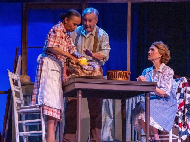 The venerable Dennis Delamar would seem ideal for bestowing the requisite bonhomie on our gracious host and eager sidekick, except… for all his wholesome triumphs as Henry Higgins, Grandpa Vanderhoff, Kris Kringle, John Adams, Hucklebee, Jacob the Patriarch, and many more, has he ever done a French accent before? Maybe that was the question Delamar was asking himself on opening night when he uncharacteristically stumbled over a few of his opening lines.