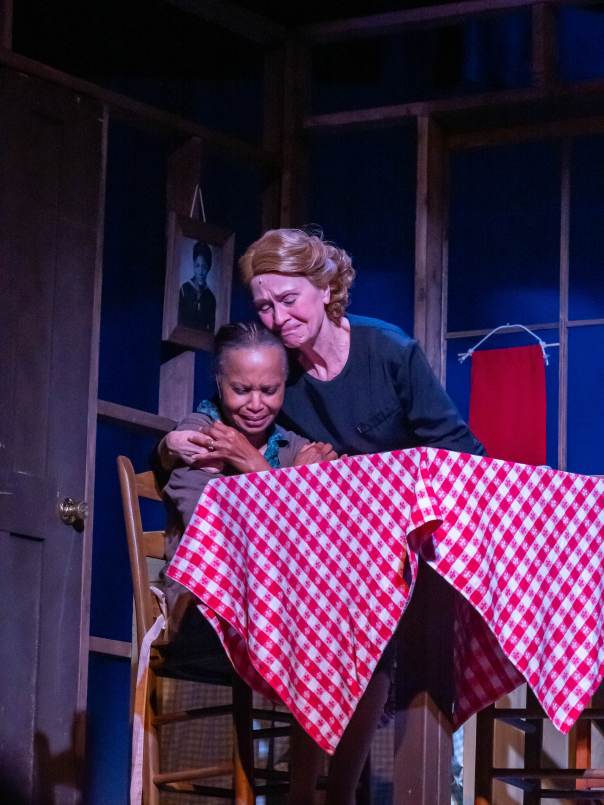 Detachment and inhumanity are inevitable results of the plum jobs Susan is able to land at Auschwitz. The cushiest requires nothing more of her than drawing a line through the names of fellow prisoners, thousands of them, who have passed through “the gas” and the crematoriums. Another requires her to sort through the clothes and possessions of those who haven’t been as lucky as she has been – she can even scavenge some choice articles of clothing. No doubt this aspect of the story fascinated LaBorde as he adapted Cernyak-Spatz’s sprawling memoir for the stage. Thinking of changes in wardrobe as the organizing principle of Susan’s narrative is his idea, not hers. Magda Guichard’s wide range of costume designs help LaBorde depict Susan’s precipitous fall from her upper middle-class status in Vienna to her total degradation at the Birkenau death camp. Delamar spares Giles from the fullest indignities that the script allows, letting his star wear a flesh-colored leotard when Susan is ordered to strip for a delousing shower and allowing her to retain her own disheveled hair when she is shaven bald. A sleekly coiffed wig is removed to suggest the transition.