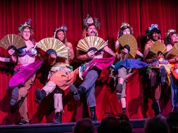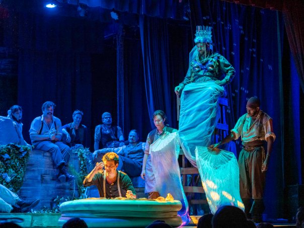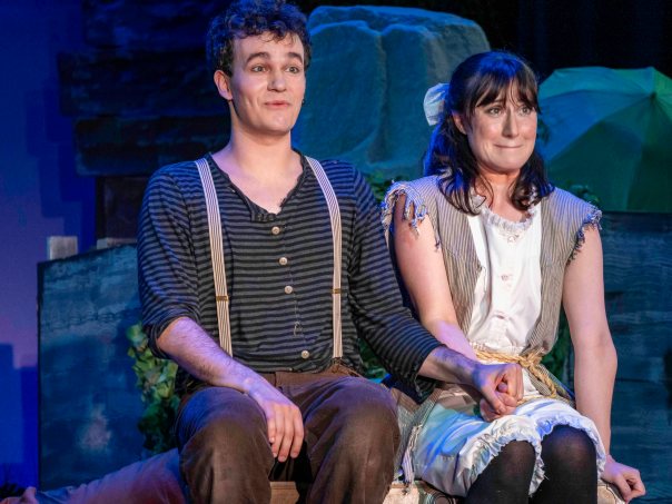 Nearly all of these players were newcomers to Starcatcher, beginning with Joshua Brand as Peter and Emma Brand as Molly, presumably arriving on the Fullwood Theater stage with ready-made chemistry. Their boy-girl antipathy is no less charming than their tentative stabs at intimacy, and both can seem fueled by the promise of adventure and ignited by its thrill. The only holdover from Bloede’s 2018 cast is Johnny Hohenstein, who in bygone days crossdressed to portray Mrs. Bumbrake, Molly’s flirtatious nanny.