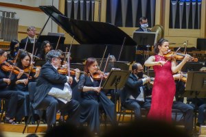 Roman could have told himself to be patient about winning us over, for his role became more complex and impressive after the only pause in the piece, when he tackled the cluster of three final movements, delivered without further pause. At the heart of this cluster, between a soulful Moderato and a joyous Allegro con moto, Ryan and his orchestra observed a reverential silence as Roman played the Rostropovich-worthy third movement cadenza. There were bowed sections featuring a melody and a bassline simultaneously and, deeper into the virtuosic display, interludes of counterpoint where he bowed with his right arm on open strings while plucking a second melody line with his left hand. You couldn’t miss the difficulties here even if you closed your eyes. Nor was the final movement anticlimactic, featuring the return of the orchestra and a more decorative and colorful return of the march motif from the opening movement.