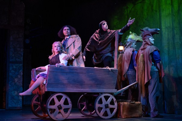 In the face of such humiliating catastrophe, Alice wished to exile herself to the Adirondacks, but Charlie Grass managed even here not to be overly annoying in her shame and mortification as the one “normal” member of her family. Love and practicality are nicely mixed in this Alice. Serene and optimistic as ever, Martin, Penny, and Paul are able to laugh off the misadventures of the previous night. Newcomer as Penny, Jeremy Cartee as Paul, and Dennis Delamar as Martin became especially endearing from this moment forward, maintaining their equanimity after this buffeting of adversity. Galumphing and awkward in the early going, in and out of his mad scientist coveralls, Cartee showed some touching solicitude toward the wife and daughter when crisis struck. Delamar, in his second go-round as Martin, has thoroughly mastered his dignity and glow, aided by Emily McCurdy’s costume design and James Duke’s lighting.