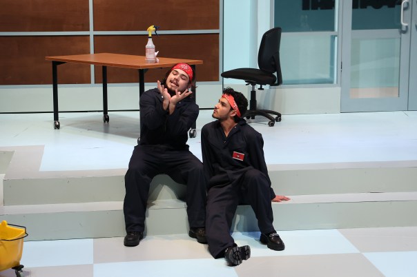 Directing this play in her Metrolina debut, Holly Nañes calls for a nicely calibrated mix of shock, resentment, curiosity, and cool from Nicolas Zuluaga as Orlando when his dad finally sheds his customary benevolence and test-drives the idea of punishment. There are no onsets of diligence, penitence, or heightened seriousness in Zuluaga’s demeanor as he dons a janitorial uniform for the first time in his life. Nor is there any childish pouting or seething resentment as he’s paired up with Rafael, the lowly immigrant.
