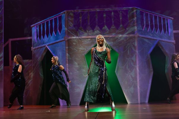 The roadblock to all this heroic questing and defying taking hold at Duke Family is the sensational Treyveon Purvis as the glittery Pythio, who describes themselves as a “non-binary plural.” No, that isn’t verbatim from Arcadia. We don’t need to understand every word of “Vision of Nowness” instantly as Pythio bodaciously belts it. If you don’t catch a phrase the first time or Purvis slurs it, you’ll get a second chance. Besides, the Go-Go’s lyrics are of little consequence once the song is done.