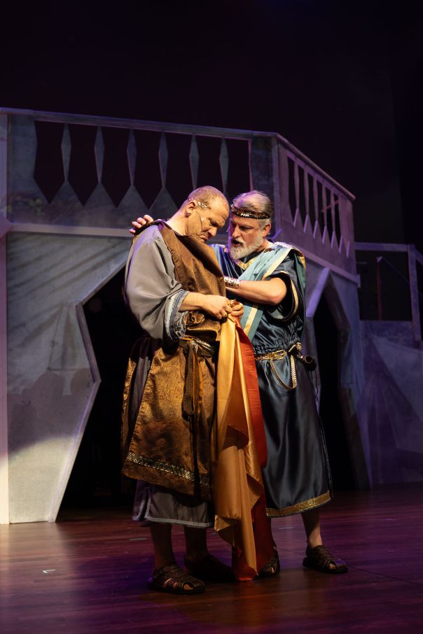 Once whatever was clogging Tommy Foster’s larynx in the first moments of Saturday night’s performance as Dametas was expelled, the longtime veteran reminded us that he could also wail. Saddled with a more earthbound voice, Rob Addison brings a nicely grizzled dignity to King Basilius that is forceful enough for the lead vocal of “Get Up and Go” and his climactic king-and-queen duet with Schacher, “This Old Feeling.”
