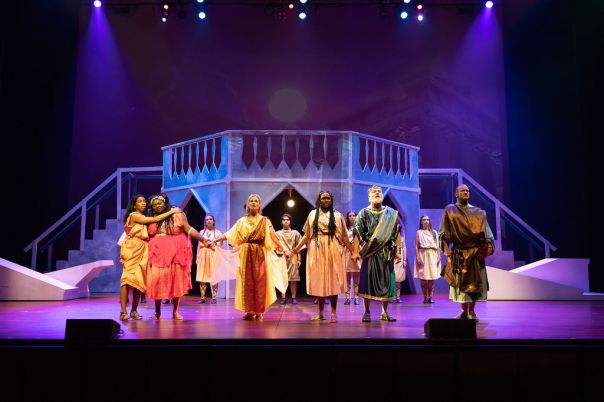 You can judge for yourself at spacious Duke Family Performance Hall as Davidson Community Playhouse rather splendidly presents its summer musical in nearly all of its gender bending glory. For this Metrolina premiere, projection designer Caleb Sigmon, scenic designer Ryan Maloney, and costume designer Yvette Moten fill the Broadway-sized stage on the Davidson College campus with eye-popping color and Hellenic style.